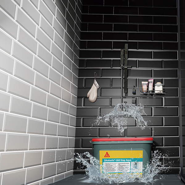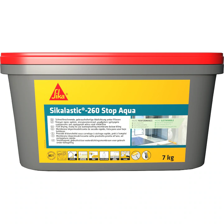 Sikalastic-260 Stop Aqua este o membrană hidroizolantă lichidă, monocomponentă, gata preparată, cu conținut de rășini pe bază de apă, pentru impermeabilizarea spațiilor umede. Oferă un strat final complet lipit de suport, pregătit pentru aplicarea plăcilor ceramice.