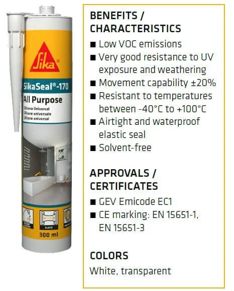 SikaSeal-170 este un etanșant siliconic cu întărire acetoxi. Este utilizat pentru etanșarea rosturilor la instalațiile sanitare și în alte zone ale locuințelor.